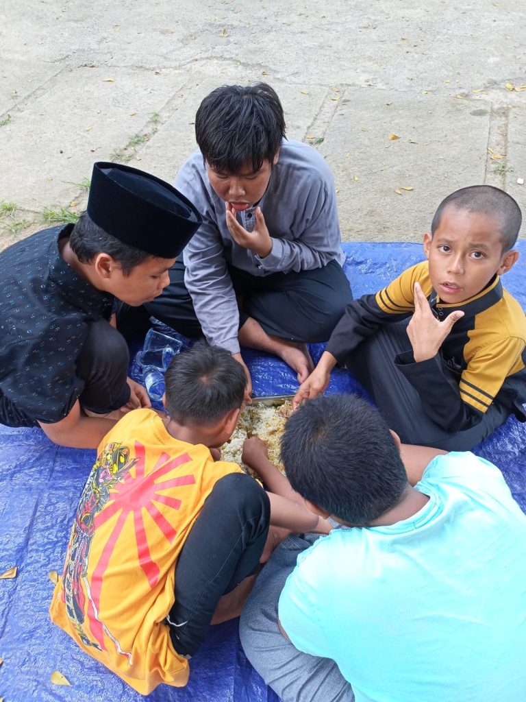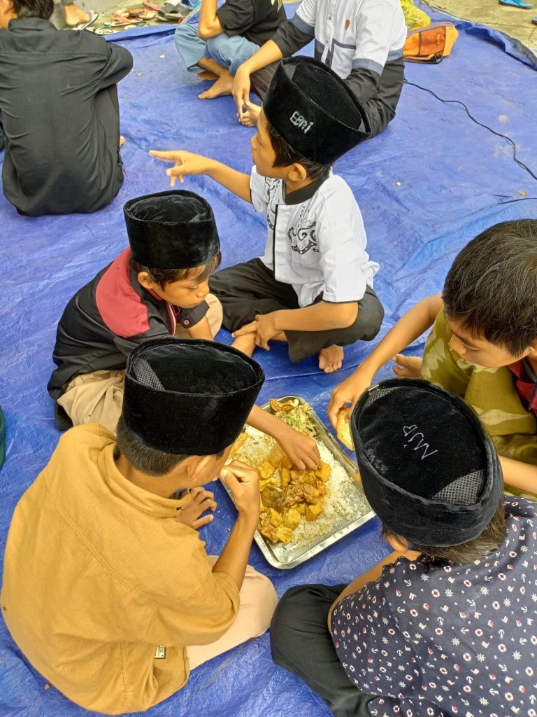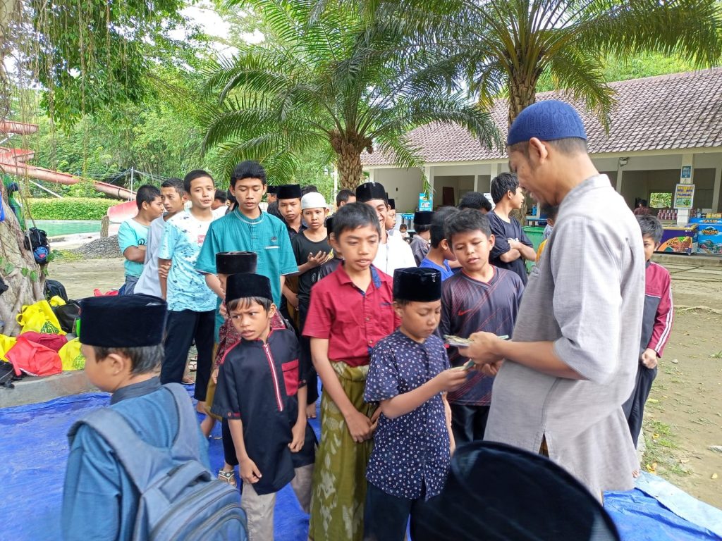 Karena waktu sudah cukup siang, santri diajak untuk sholat berjamaah dan makan siang guna mengisi kembali energi yang telah terkuras selama mandi kolam dan seluncuran.