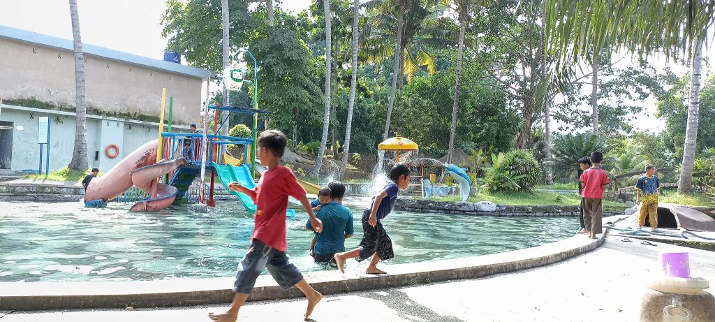 Adapun santri kecil, mereka memilih tempat seluncuran yang dangkal dan pendek. Sehingga mereka bisa menikmati mandi air tanpa takut tenggelam.